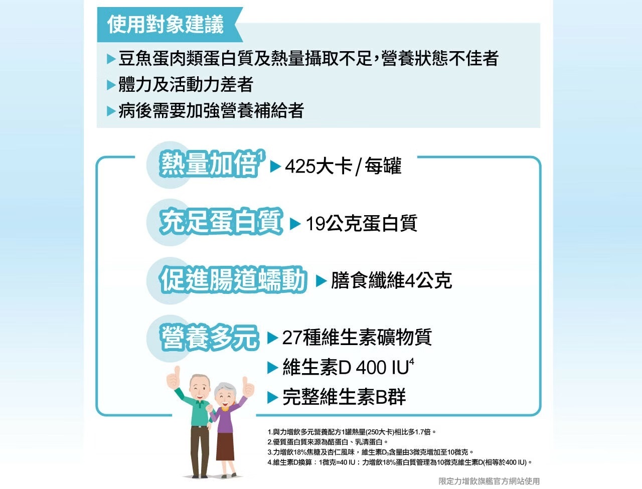 1.8大卡/毫升 熱量濃縮配方,病後補養、增強體力。