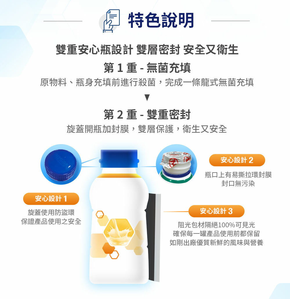 每日口飲 1–2 罐或依照醫師/營養師建議。開瓶後建議冷藏,並於 24 小時內飲用完畢。