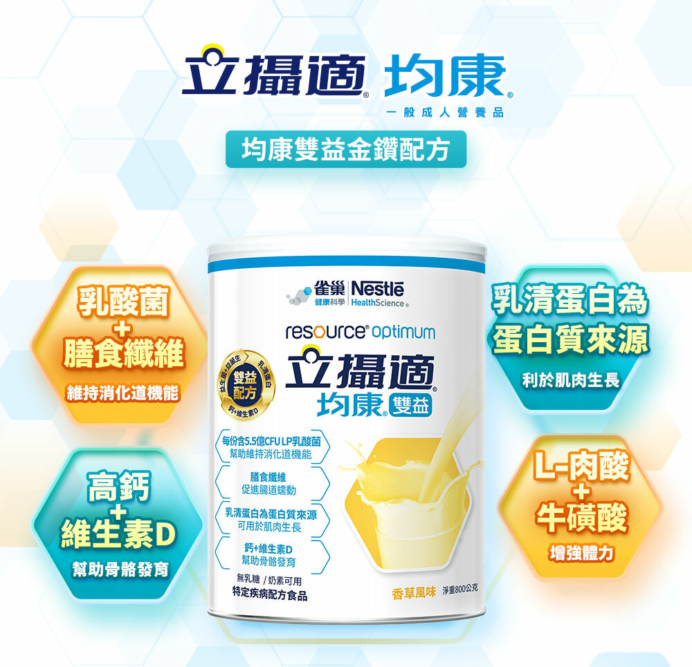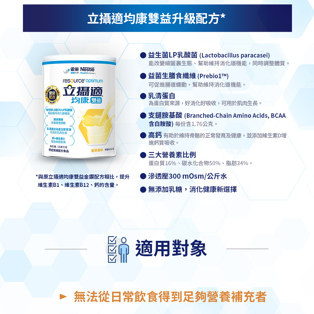 立攝適均康雙益配方為衛福部核准之特殊營養品,專為術前術後、病後康復、營養不良或需補充膳食纖維族群設計。