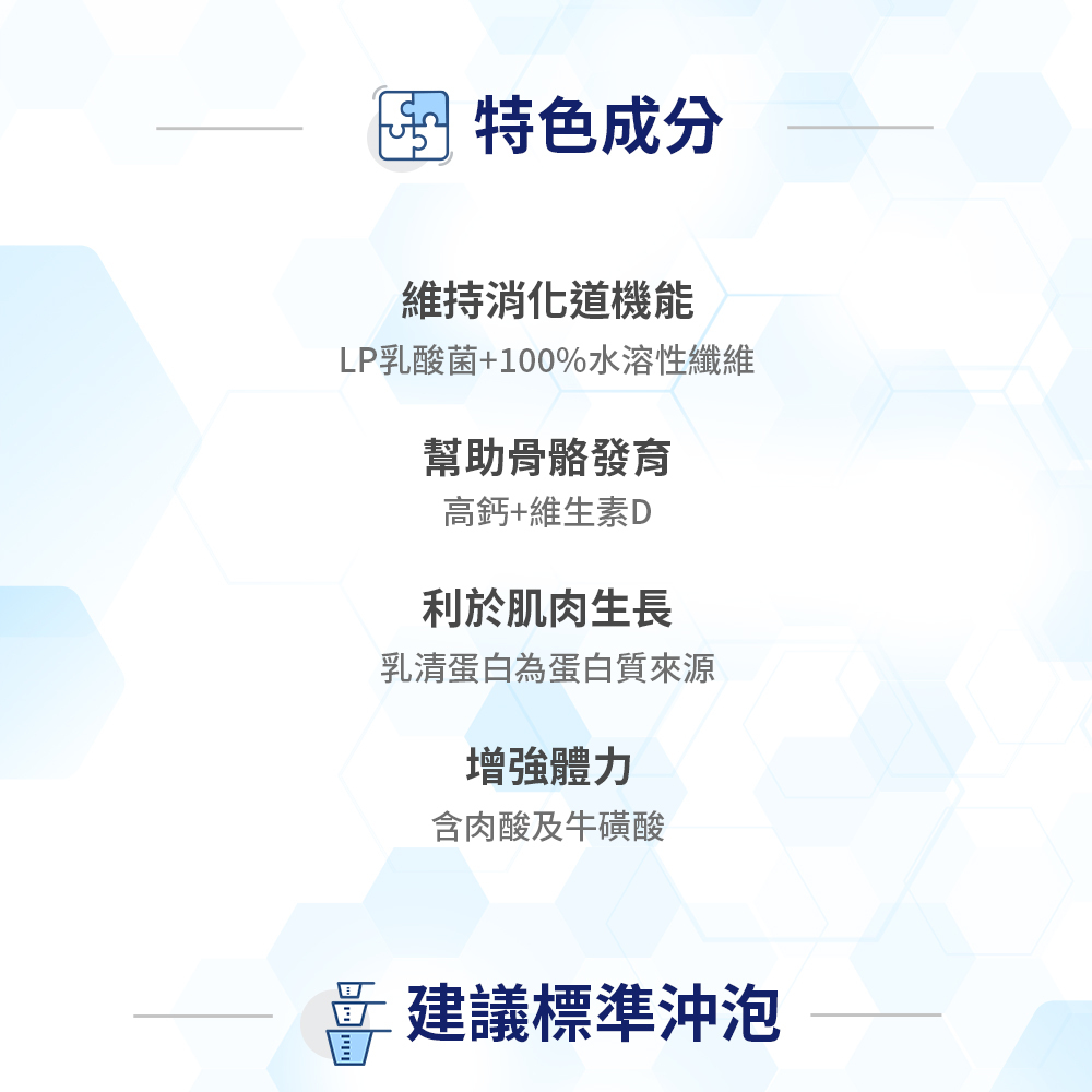 再搭配 高鈣、維生素D、乳清蛋白與BCAA,全方位補給每日關鍵營養,穩定體力與抵抗力。