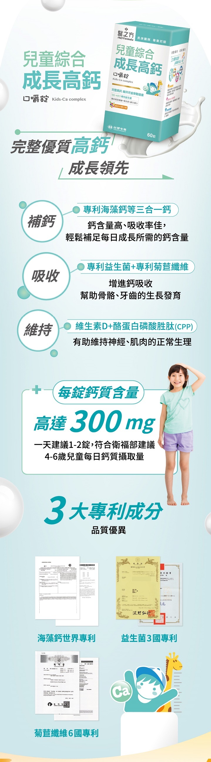 ★每日2錠600mg鈣=6杯100c.c鮮奶,符合衛生福利部建議4~6歲孩童每日鈣質攝