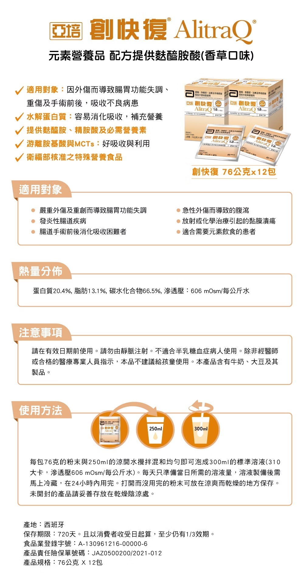 ●適用對象:因外傷而導致腸胃功能失調、重傷及手術前後,吸收不良病患