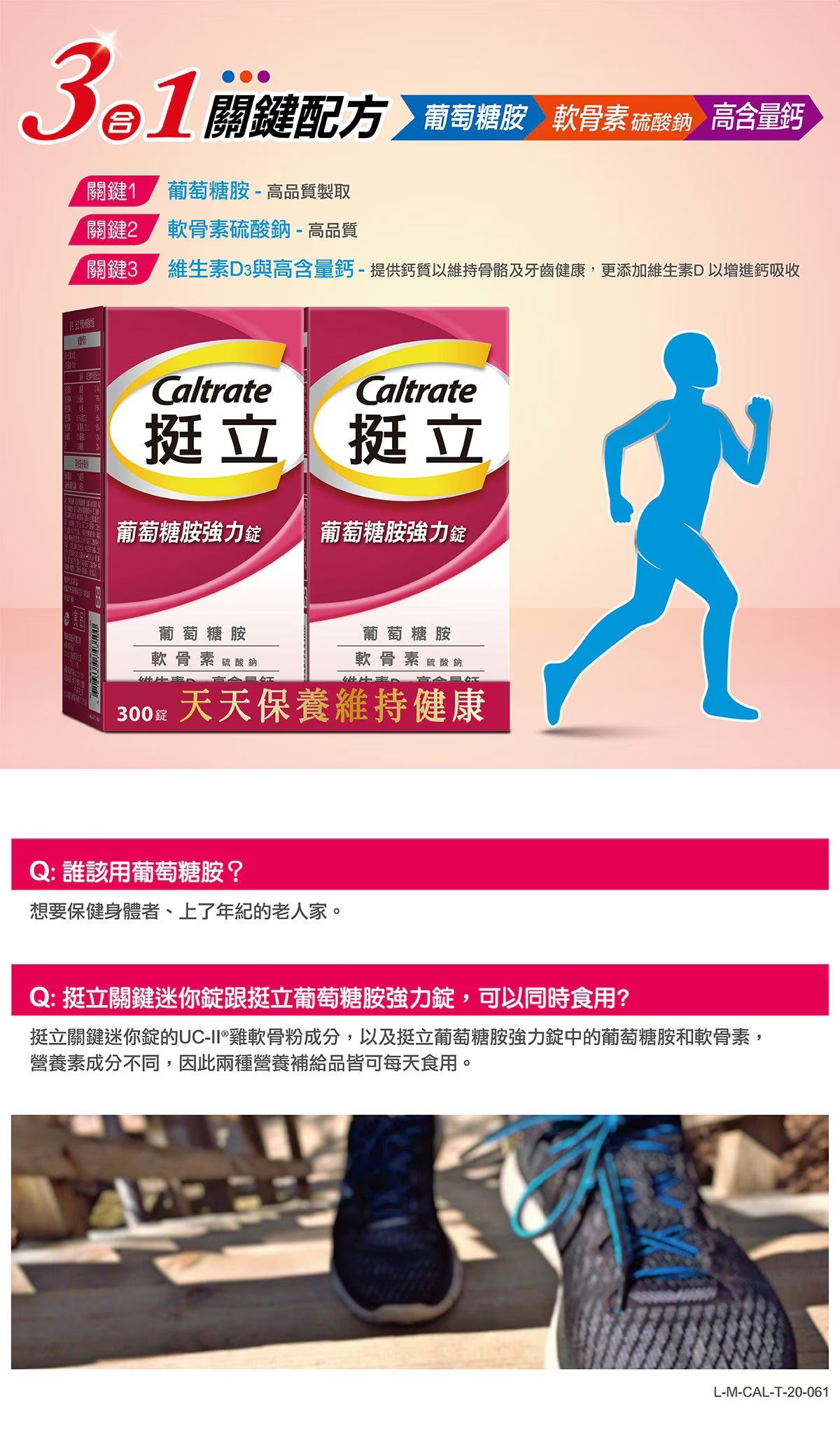 每份三錠添加葡萄糖胺750毫克、豬軟骨素硫酸鈉150毫克