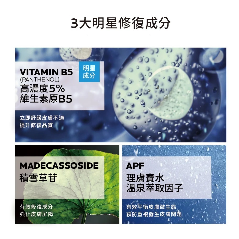 添加有效修護成分維生素原B5、積雪草苷,立即舒緩、全面修護各類肌膚不適。富含理膚寶水溫泉水,能立即保濕肌膚,極清爽質地,不黏膩好吸收。成分安心,無添加香精及酒精。