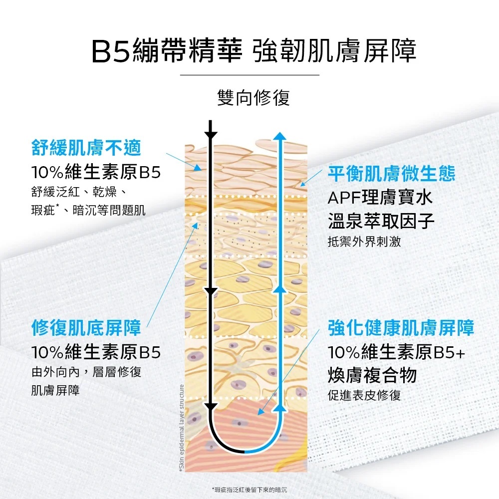 產品說明: 極速修復乾燥、泛紅、脫屑、暗沉、瑕疵等各式問題肌。含三大修復成分:[高濃度10%維生素原B5]+[理膚寶水溫泉萃取因子]+[HEPES],立即舒緩、全面修復各類肌膚不適。使用1小時,提升68%肌膚屏障力,79%認為明顯改善乾燥*。經受測者測試,88%認為有感舒緩肌膚不適, 75%認為瑕疵明顯淡化。**成分單純,無添加香精/色素/Paraben防腐劑。敏感肌、特殊美容後亦適用。*25位亞洲敏感肌受試者,使用一小時儀器檢測結果**52位21-50歲亞洲敏感肌受試者,一天使用兩次,使用28天消費者自我評估結果