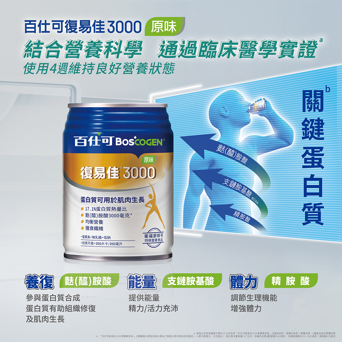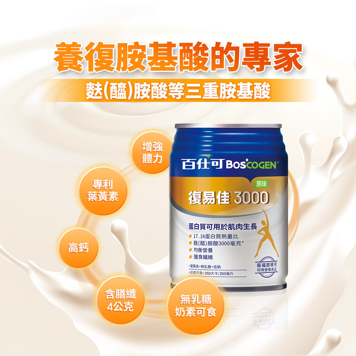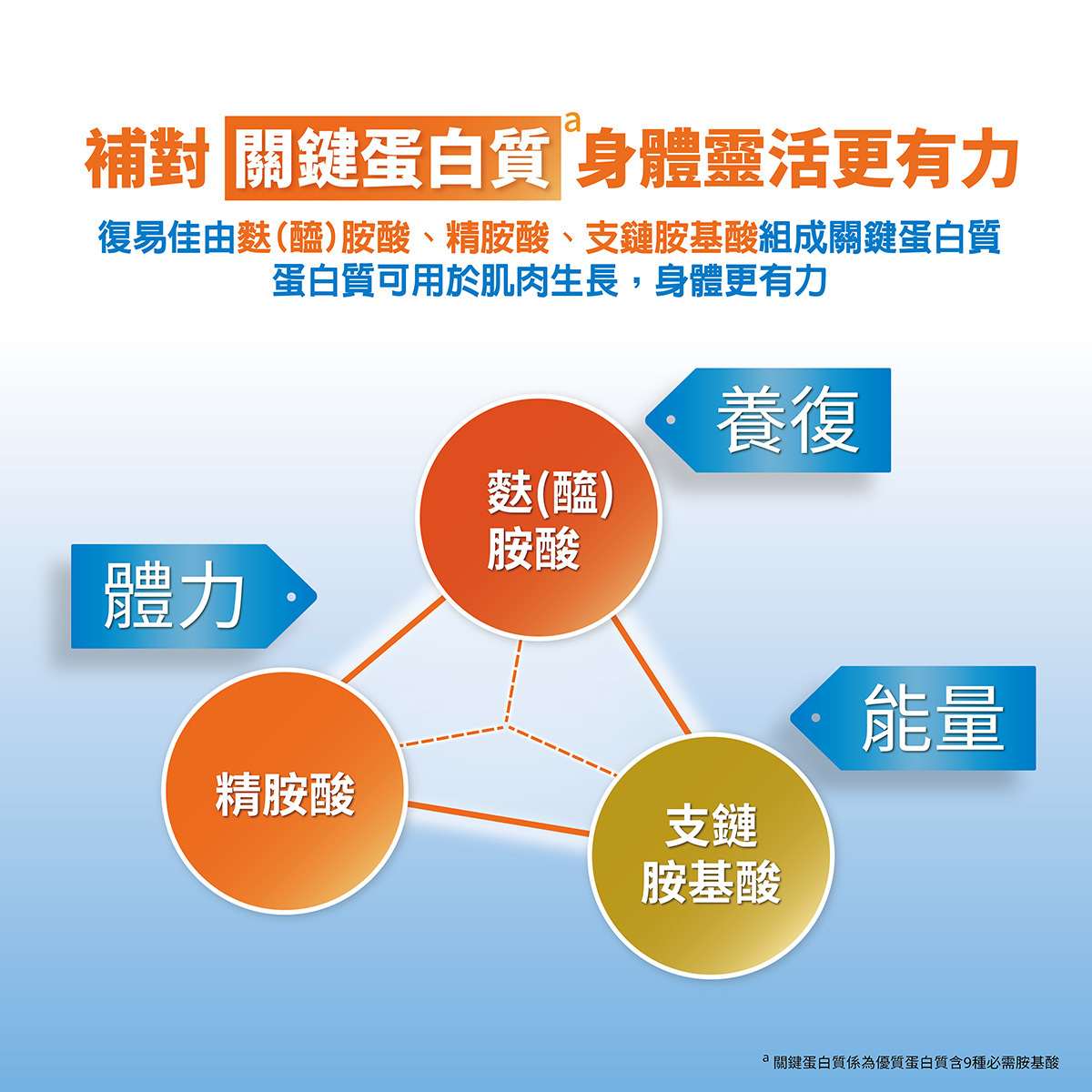 復易佳3000營養素的「關鍵蛋白質」是由麩(醯)胺酸、精胺酸、支鏈胺基酸等三重胺基酸組成,能提供養復、體力、能量,全方位的保健。