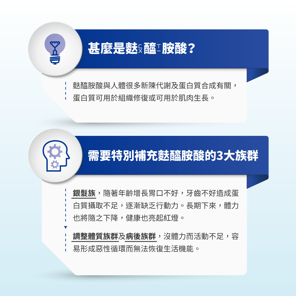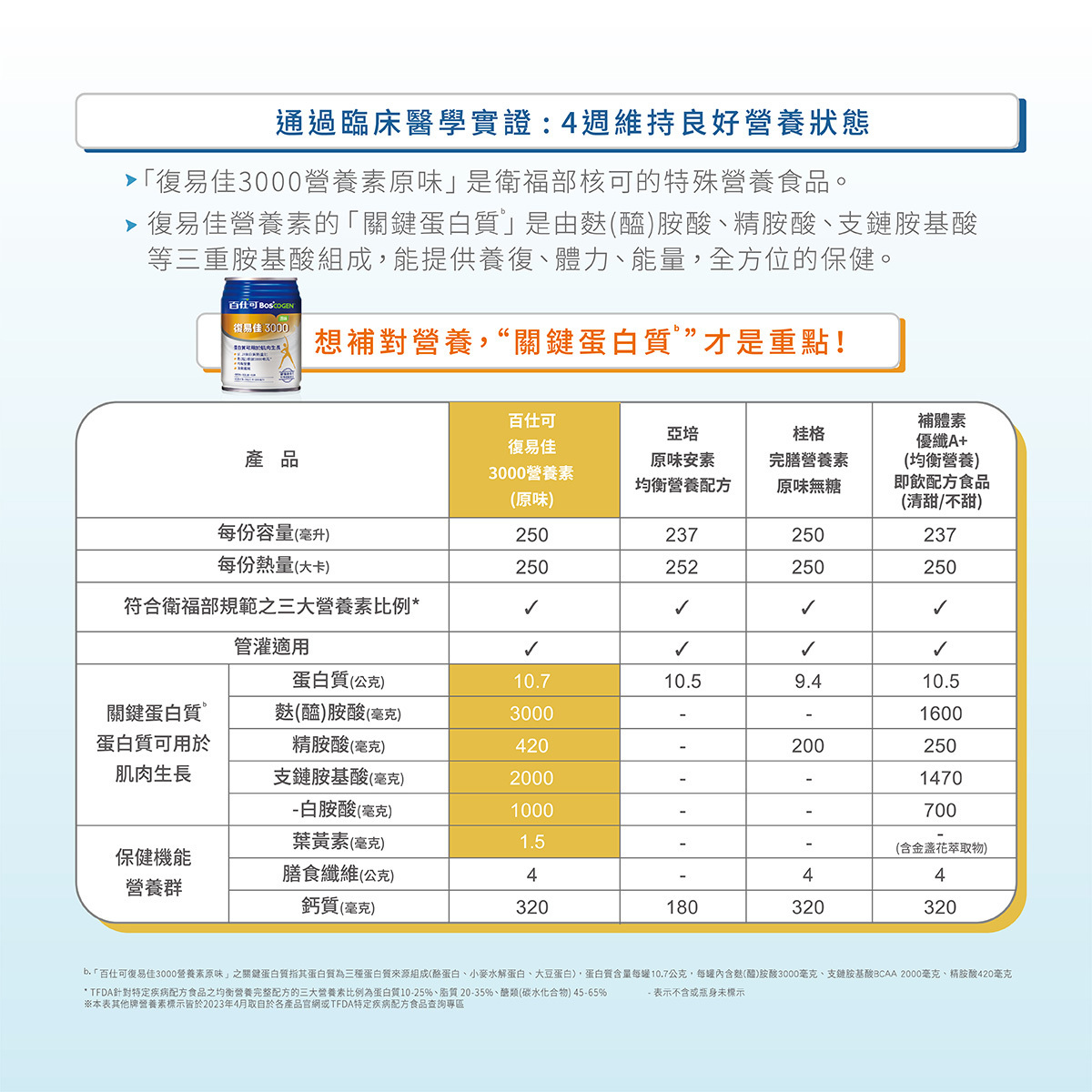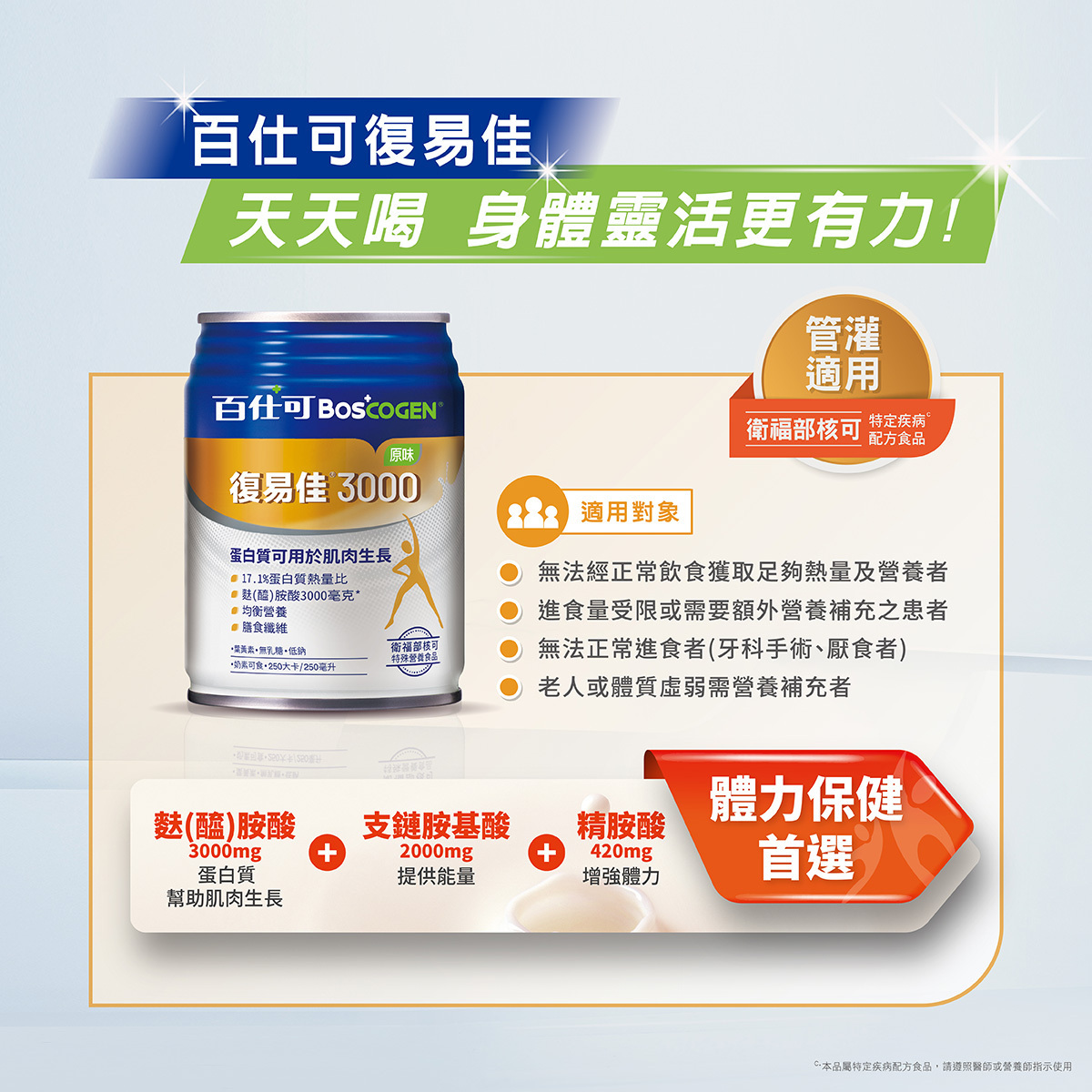 復易佳3000營養素的「關鍵蛋白質」是由麩(醯)胺酸、精胺酸、支鏈胺基酸等三重胺基酸組成,能提供養復、體力、能量,全方位的保健。
