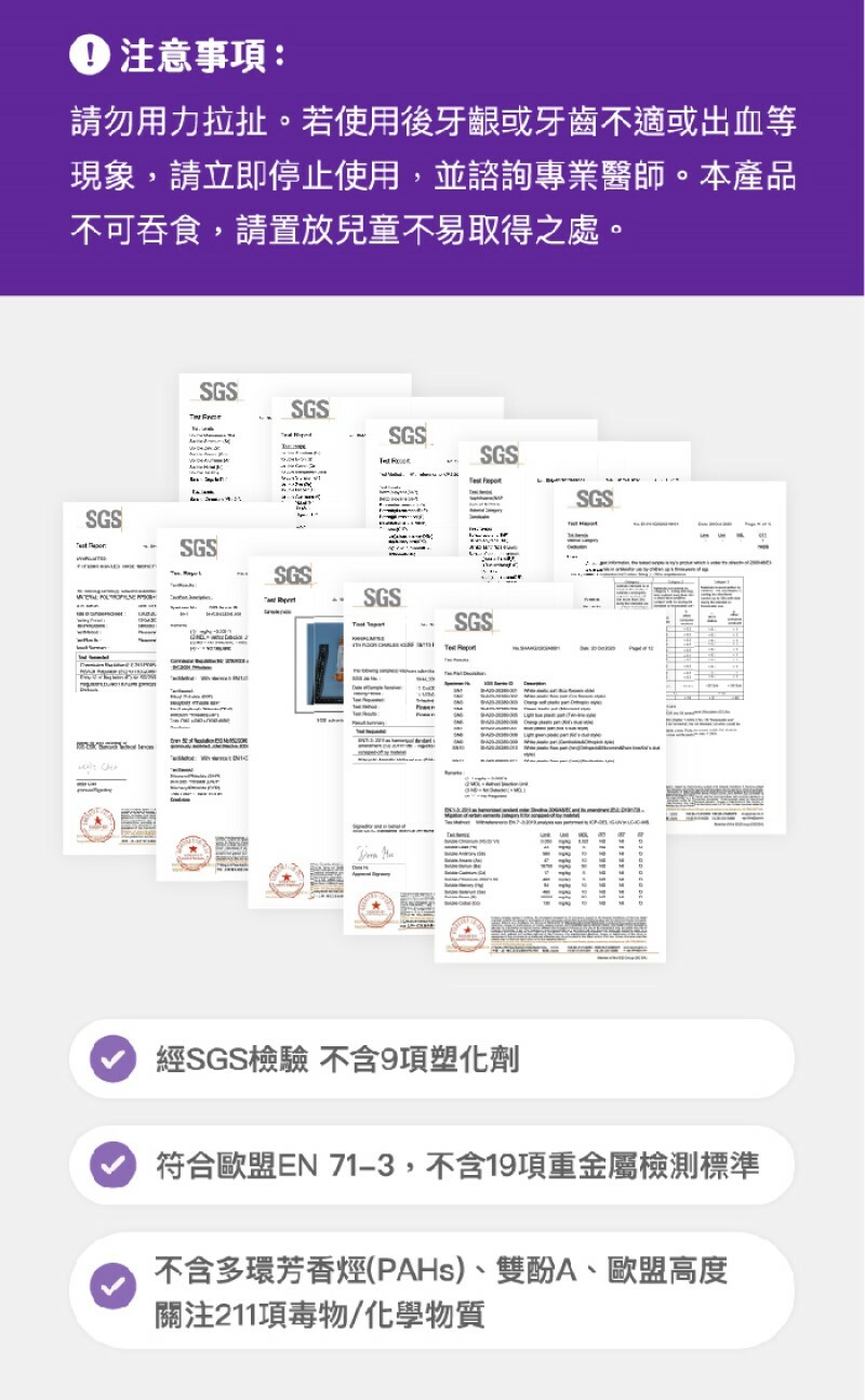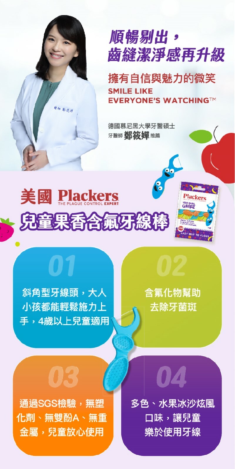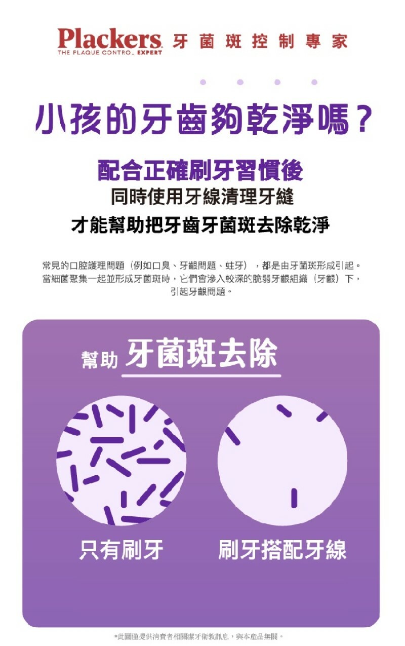 .雙重握把設計和斜角型的牙線頭,專為大小兒童設計,讓各個年齡層的兒童都易於使用