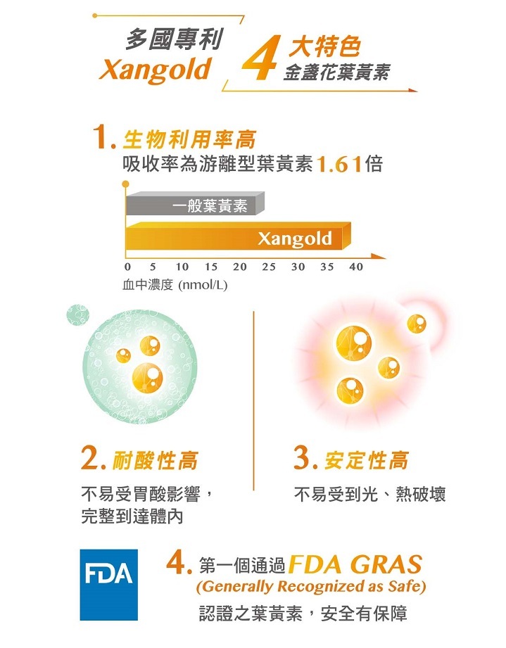主要成分:金盞花萃取物(含葉黃素、玉米黃素)、山桑子萃取物、葡萄糖酸鋅、DHA藻粉、維生素C、β-胡蘿蔔素、黑豆萃取物、維生素E、維生素B2、維生素B6、維生素B1