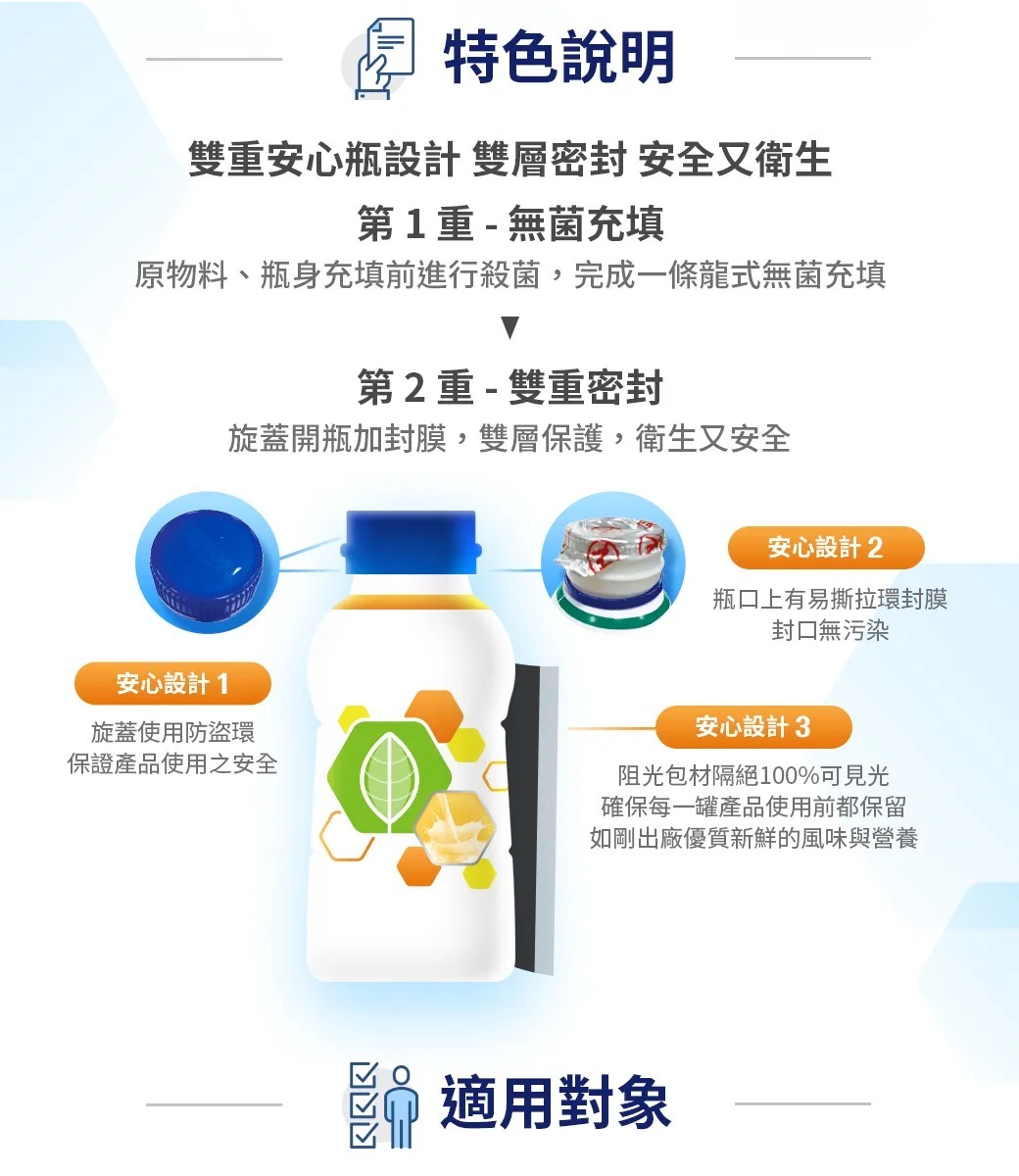 濃縮熱量 1.5 kcal/mL:每瓶 250 mL 即約 375 kcal 熱量補給,適合食量減少、需要高密度能量補充者。